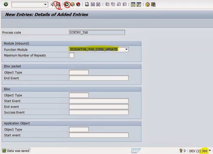 Step92. Provide the Function module name, Idoc name and message type. Save it and clcik on back button.