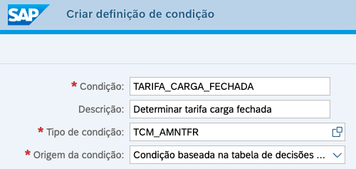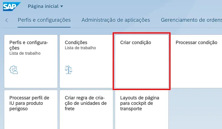 Passo 1. A partir do Fiori Launchpad execute o aplicativo Criar condição no grupo Perfis e configurações. Como falei antes… aqui no TM chamamos uma regra do BRF+ como condição.