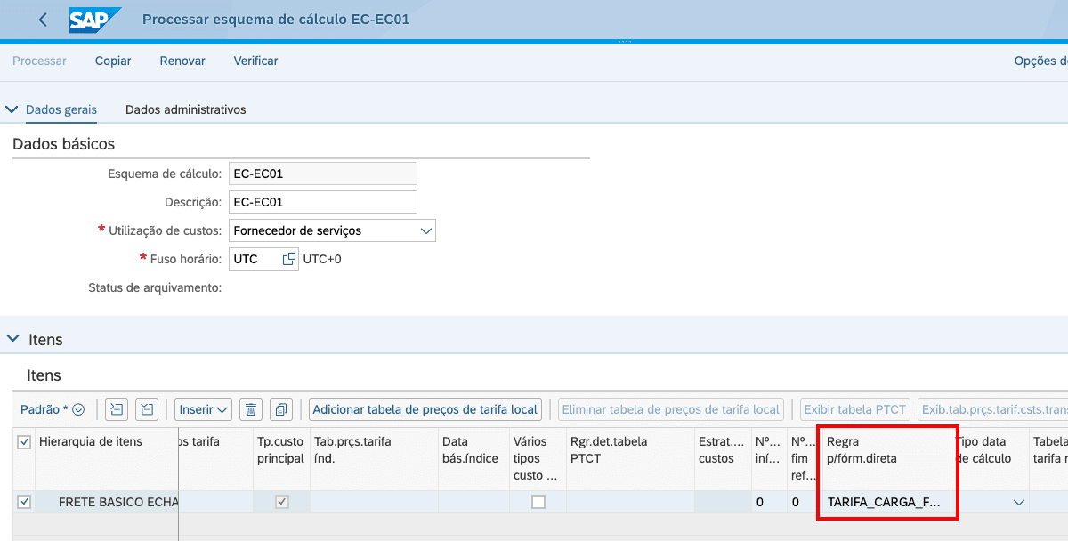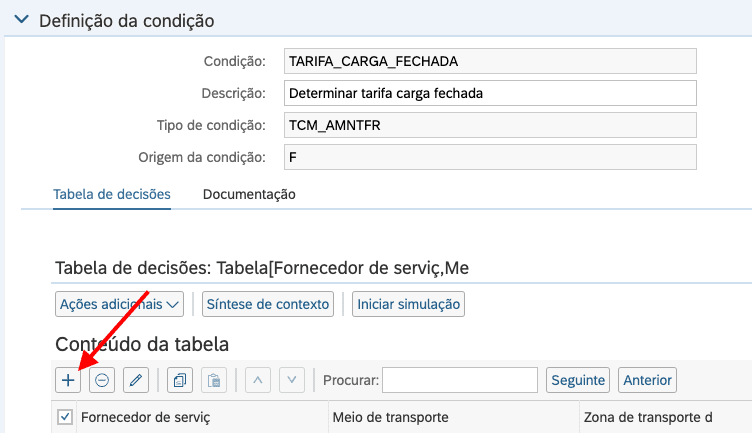 Passo 8. Bom, agora precisamos ajustar o esquema de cálculo com a nossa condição. Para isso abra o seu esquema de cálculo e adicione uma nova condição de tarifa e na linha do item da sua condição… busque a coluna (mais a direita) chamada Regra p/fórm.direta e adicione a regra que você criou. Grave suas alterações.